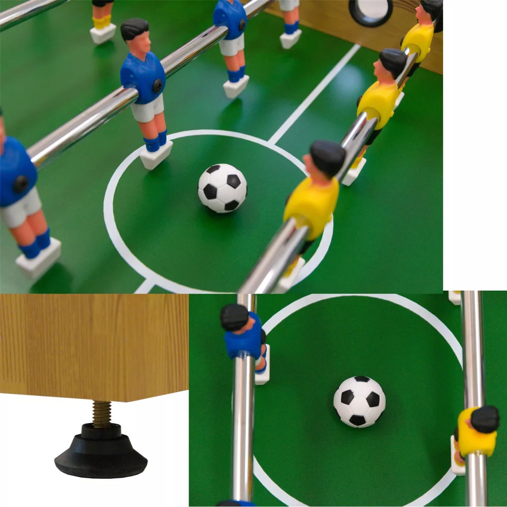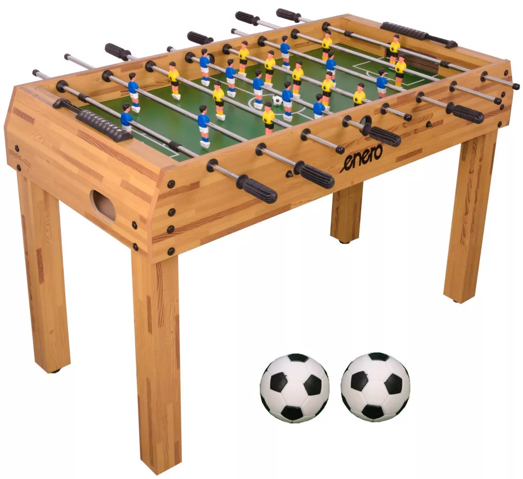 Az ENERO Tornado csocsóasztal erős fa kivitelben készült, így stabil játékélményt nyújthat otthoni használat során. A 121x61x79 cm-es méretnek köszönhetően kényelmes játékteret biztosít, a masszív felépítés pedig hozzájárulhat a hosszabb élettartamhoz. A szett két focimintás csocsólabdát is tartalmaz, így a játék azonnal kezdődhet. Klasszikus megjelenésű, időtálló választás.