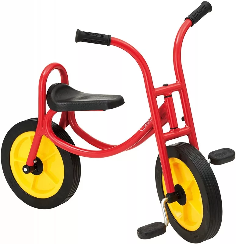 A bicikli kialakítása lehetővé teszi, hogy a gyermekek fokozatosan ismerkedjenek meg a kétkerekű kerékpározás alapjaival. A pedálok az első kerék tengelyére kerültek, így a termék futóbicikliként is használható, valamint pedállal hajtva kerékpárként is alkalmazható azok számára, akik már rendelkeznek megfelelő egyensúlyérzékkel. A tömör gumiból készült kerekek csendes gördülést biztosíthatnak, míg a zárt keréktárcsák a biztonságos használatot szolgálják. A masszív, festett fémváz a rendszeres, óvodai használathoz igazodik. Az összeszerelés egyszerűen, külön szakértelem nélkül elvégezhető.