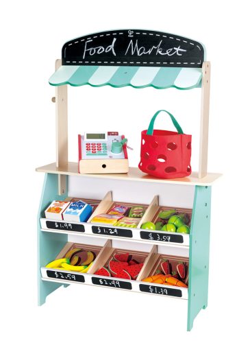 • Tartalom: árusító stand, pénztárgép hang- és fényhatással, 4 szelet felezhető görögdinnye, 4 db felezhető sárgarépa, 4 db felezhető körte, 4 db banán, dobozos tej, narancslé, 1 csomag keksz, 1 csomag sajtrudacska, bevásárló szatyor, kosár, 2 db bankkártya, 25 db bankjegy