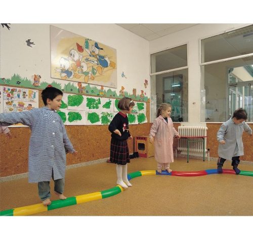 A félhenger alakú elemekből egy egyenes, végigjárható pálya állítható össze, amelyen a gyerekek lépkedve, egyensúlyozva és haladva próbálhatják ki a mozgásukat. A pálya használata hozzájárulhat az egyensúlyérzék és a testtartás gyakorlásához, miközben a mozgás játékos formában jelenik meg.