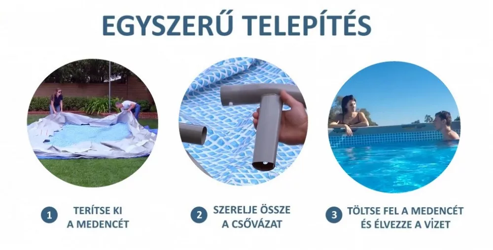 A medence kizárólag teljesen vízszintes, stabil, sík terepre telepíthető. Az alapnak el kell bírnia a feltöltött medence súlyát az időjárási körülményektől függetlenül. Gondoskodjon arról, hogy a medencéből kifolyó víz szabadon el tudjon folyni, megelőzve ezzel a környezet károsodását. A típus nem alkalmas talajba való süllyesztésre. A telepítés ideje kb. 45 perc, két felnőtt segítségével.