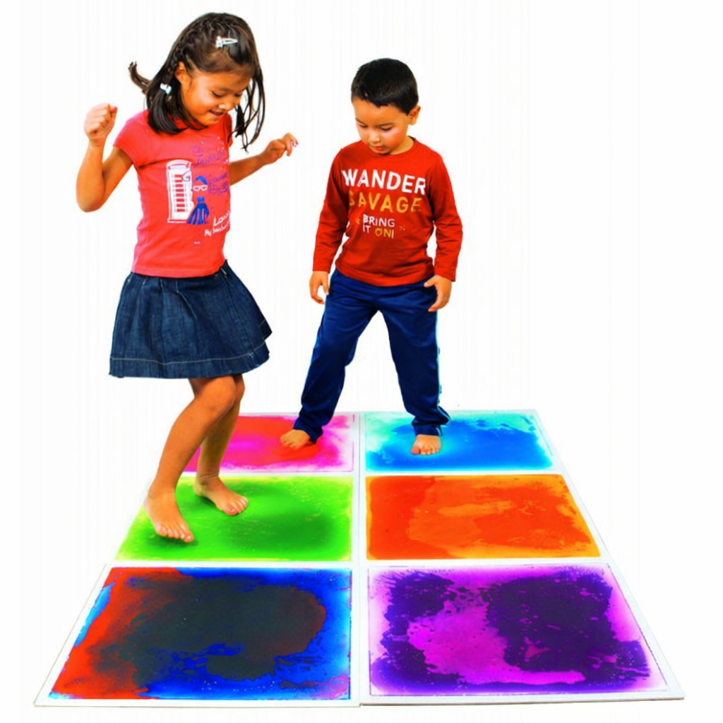 A padlólapok belsejében színes, folyékony anyag található, amely lépésre, nyomásra és mozgásra kavarogni és áramlani kezd. A felületen járva vagy rálépve a színek látványosan elmozdulnak, ami különleges, játékos élményt ad. A folyadékos kialakítás kellemes érzetet nyújt a talp alatt, miközben hozzájárulhat ahhoz, hogy a használó jobban figyeljen a mozgására és az érzékelésére. A csúszásmentes felület stabilabb érzetet ad a használat során, a lapok pedig könnyen tisztíthatók és elpakolhatók. A 6 darab padlóelem külön vagy egy nagyobb felületként is elrendezhető, így a szett sokféle játékos és mozgásos feladathoz használható.