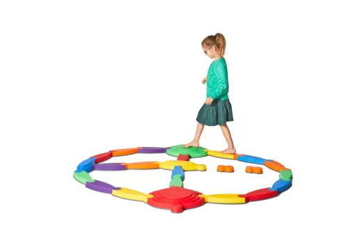 A rugalmas elemek segítségével különböző formákban építhető pályák hozhatók létre, amelyek támogatják a gyermekek egyensúlyfejlesztését és biztonságos mozgásélményt biztosítanak. Az élénk színek és a csúszásmentes felület ösztönzi a gyerekeket az aktív mozgásra, miközben fejleszti testtudatukat és koordinációjukat.