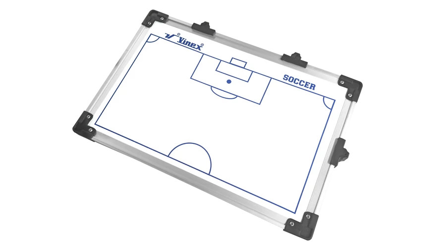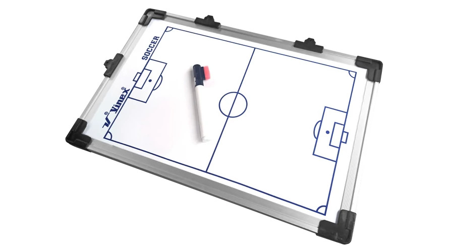 A VINEX futball taktikai tábla 90×60 cm-es méretének köszönhetően jól átlátható felületet biztosít a játékszituációk bemutatásához. A kétoldalas kialakítás lehetővé teszi különböző taktikai elemek szemléltetését, az egyik oldalon teljes felületű, a másik oldalon részben mágnesezett megoldással. Az alumínium keret stabil szerkezetet ad a táblának, a műanyag sarkok pedig a mindennapos használathoz igazodnak. A mellékelt mágnes játékosok segítségével könnyen átrendezhetők a felállások, míg a táblafilc lehetőséget ad a mozgások és játékelemek jelölésére. A nagyobb méret különösen alkalmas csoportos megbeszélésekhez és edzések előtti taktikai áttekintéshez.