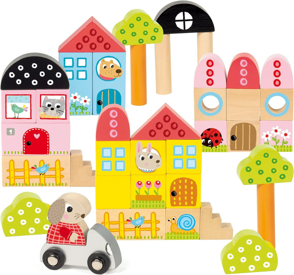 A Goula Fa Mese Építőkocka készlet kiváló választás a kisgyermekek számára, hogy játék közben megismerkedjenek az építés alapjaival és a térbeli formákkal. A készlet tartalmaz színes fa építőelemeket, amelyekből egy mesebeli kisvárost lehet létrehozni. A játék különlegessége a mágneses nyuszi, amely az autóba helyezhető, így a gyermekek még izgalmasabb történeteket alkothatnak. Az építés során fejlődik a kreativitás, a problémamegoldó képesség és a finommotoros készségek.