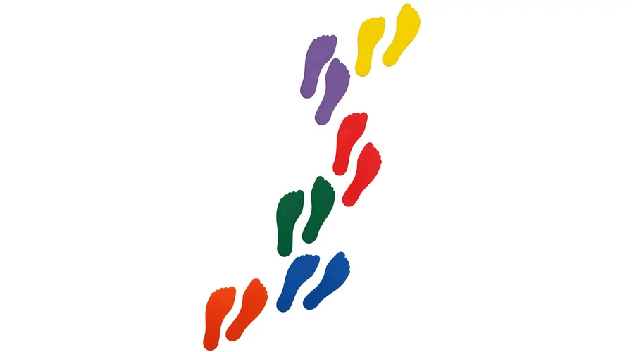 Padlóra helyezhető, színes, láb alakú gumi jelölőkészlet mozgásos és ügyességi feladatokhoz.