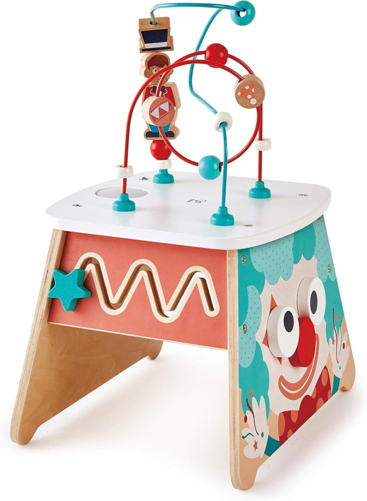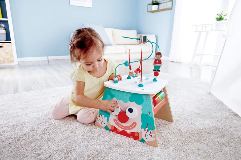 A Aktív kocka - világító - Hape egy színes, interaktív fejlesztő játék, amely játékosan segíti a gyermekek motorikus készségeinek, szem-kéz koordinációjának és problémamegoldó képességének fejlődését. A cirkuszi témájú kocka minden oldalán egy-egy új játékos kihívás várja a kicsiket, hogy felfedezhessék a különböző formákat, színeket és mozgásokat. A beépített világító elemek és mozgatható elemek még izgalmasabbá teszik az élményt. A tetején található golyóvezető pálya, a forgatható bohóc arc, a zsonglőr alakzat, a mozgó prizmák és a kanyargós csillagvezető mind hozzájárulnak a finommotorika, a szem-kéz koordináció és a vizuális érzékelés fejlesztéséhez.