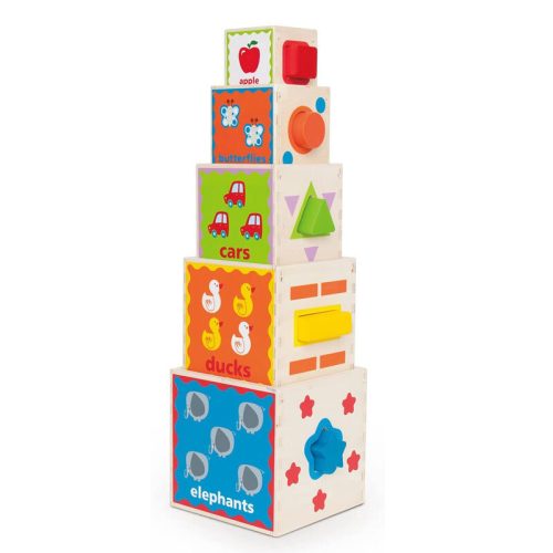 A Szórakoztató Piramis - Hape egy fa építőkészlet, melyet úgy terveztek, hogy a kisgyermekek játékos módon fedezhessék fel a színek, formák, betűk és számok világát. A készletben található fakockák egymásra vagy egymás mellé építhetők, így a gyerekek különböző módokon alakíthatják ki a piramis szerkezetét. A változatos képek és feliratok révén a készlet nemcsak szórakoztató, hanem elősegíti az alapvető készségek gyakorlását is.