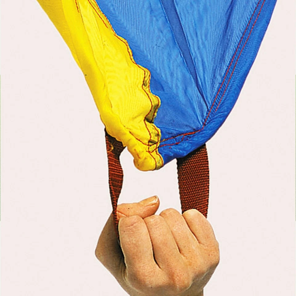 Az ejtőernyő négy sarkát megfogva a gyerekek óvatosan fel-le mozgatják, miközben egy kisebb társukat a közepére ültetik. Fontos: ezt a gyakorlatot csak felnőtt felügyelettel szabad végezni!