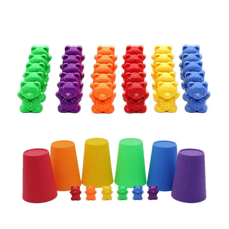 • A készlet tartalma: poharak, kis macik, csipeszek és dobókockák.