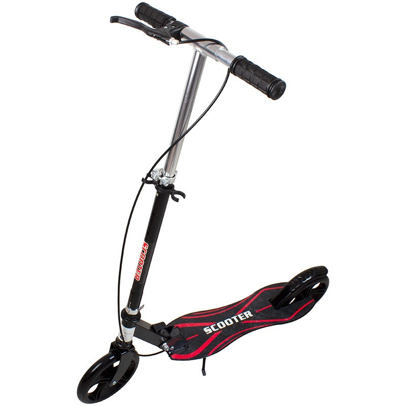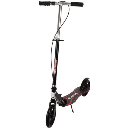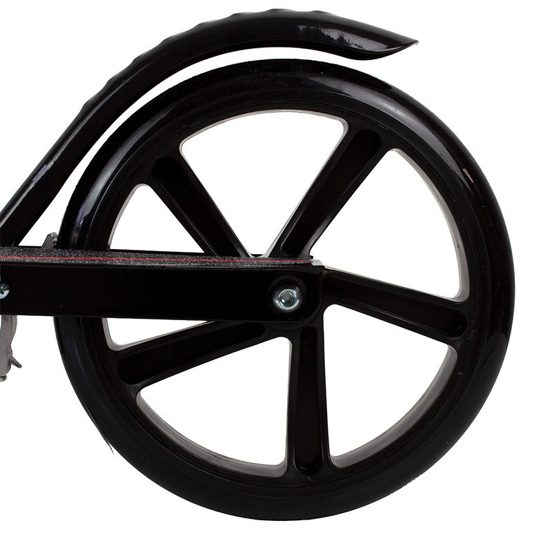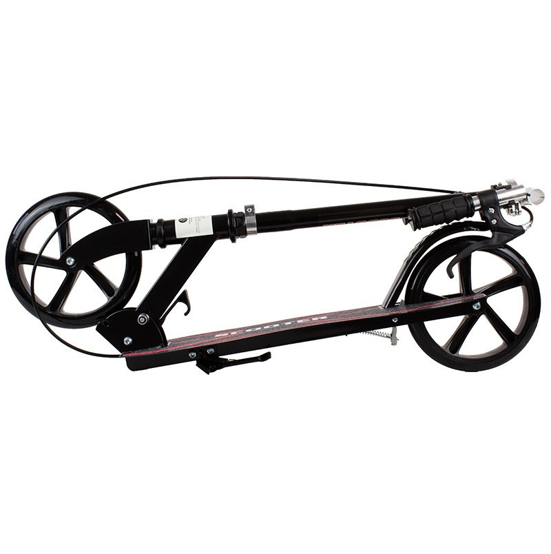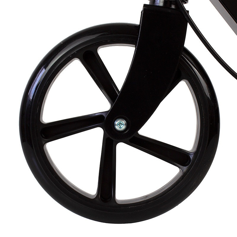 A fekete, 200 mm-es kerekű összecsukható roller állítható kormánnyal és fékkarral készült.