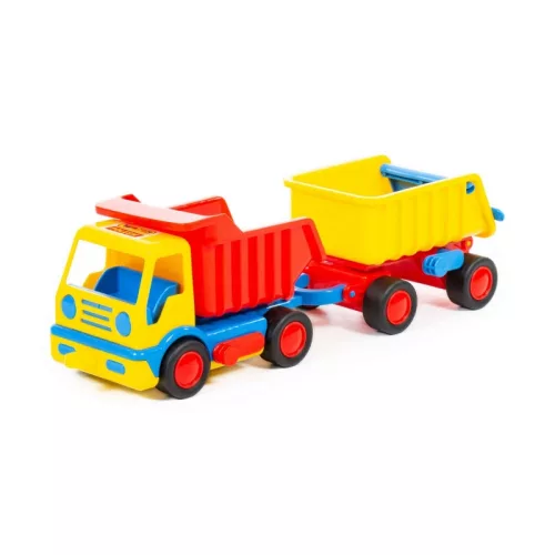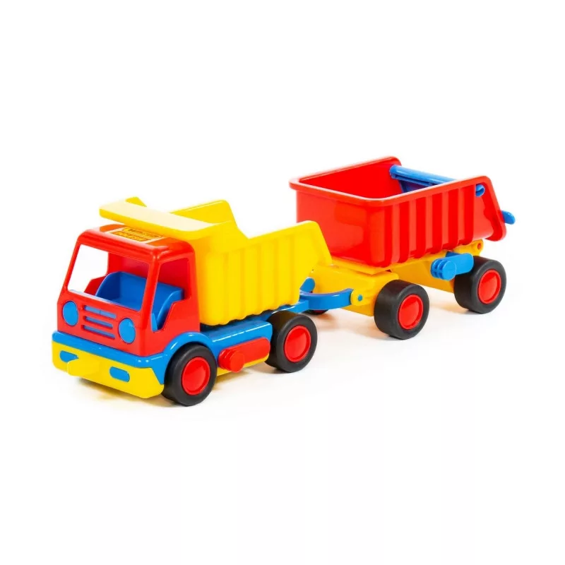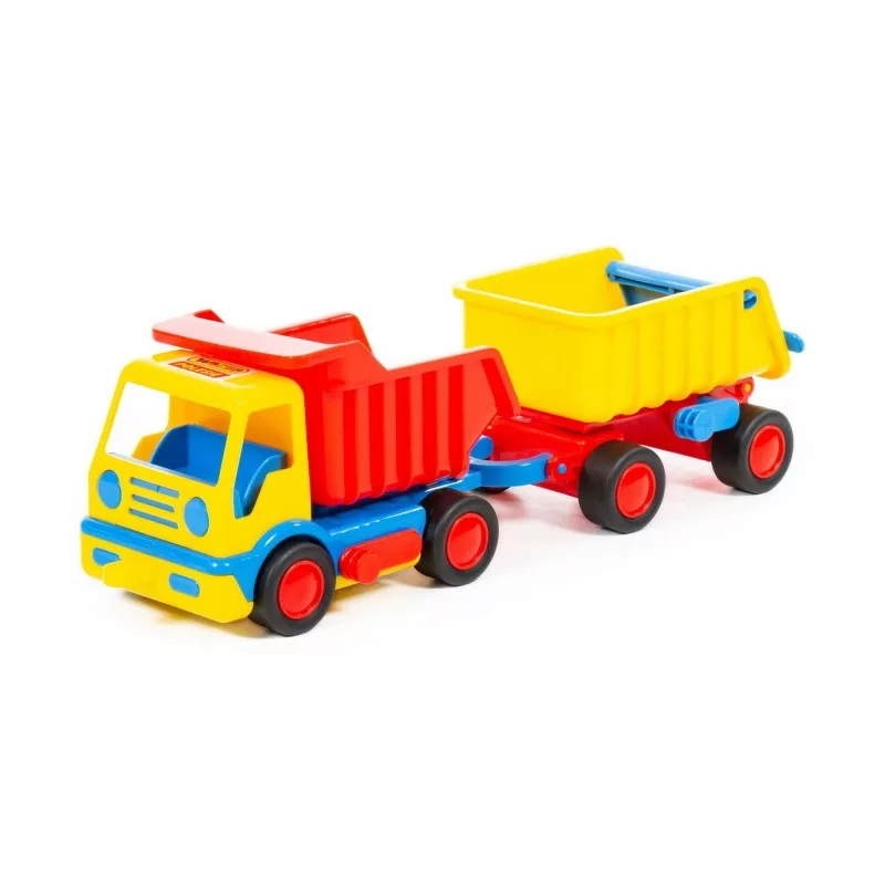A teherautóhoz kapcsolt utánfutó további szállítási lehetőséget kínálhat, így a gyerekek egyszerre több „építőanyagot” mozgathatnak játék közben. A billenthető rakfelületek játékos funkciót adnak a járműnek, hiszen a kicsik egy mozdulattal leboríthatják a homokot, köveket vagy más apró játékokat. A tartós műanyag kialakítás hosszan használhatóvá teheti a járművet, az élénk színek pedig fenntarthatják a gyerekek figyelmét. A gyártó időnként felcseréli a piros és sárga színeket, így minden csomag meglepetést rejt.