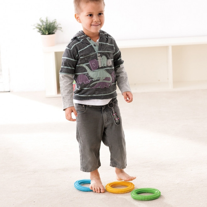 A Tüskés fejlesztő karika WEPLAY három különböző erősségű karikát tartalmaz, amelyek segítenek a gyermekek kézizomzatának fejlesztésében. A tüskés felület masszírozza a tenyereket és ujjakat, miközben a karikák használata erősíti a csuklókat, javítja a kéz- és ujjtartást. A szett ideális a finommotorika és a koncentráció fejlesztésére. A különböző erősségű karikák segítségével a játék során a gyermekek fokozatosan fejleszthetik kézügyességüket.